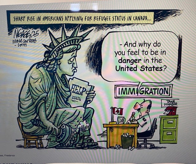 Here in Canada, Poilievre and his Tories are pushing hard to pass more anti-crime laws, spend more money on the military and defense, put more people in jail, and pushing against immigration. Prime Minister Carney is walking a couple of teetering steps to the left.