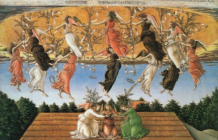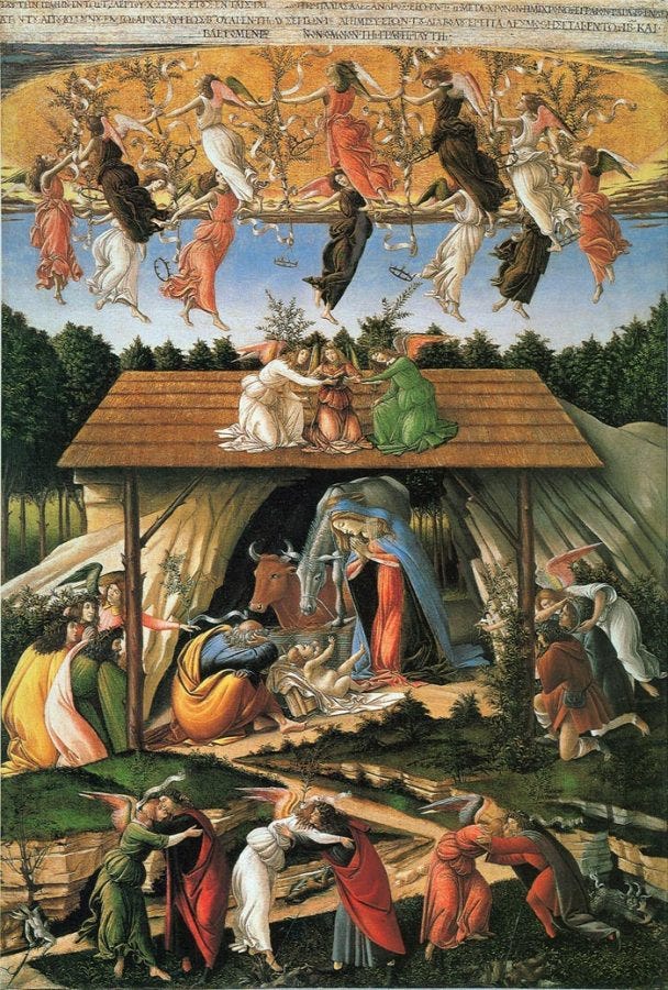 Featured painting at the top: Sandro Botticelli, Mystical Nativity (detail). Painted c. 1501, tempera on canvas, 108.6 x 74.9 cm. You can find it in the National Gallery, London. The entire painting is below: you can read more on this Renaissance painting and the artist here.
